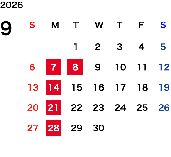 定休日:月曜日・第一火曜日(変則的な場合がございます。詳細はカレンダーをご確認ください)