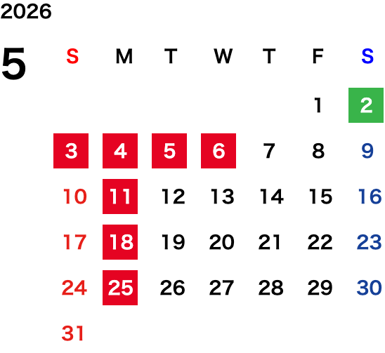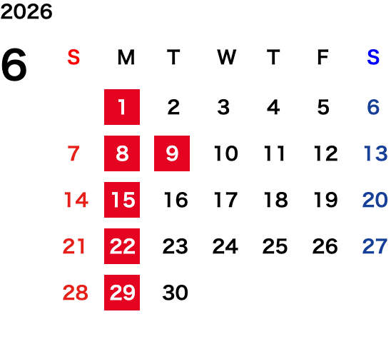 毎週月曜日・第一火曜日(変則的な場合がございます。詳細はカレンダーをご確認ください)